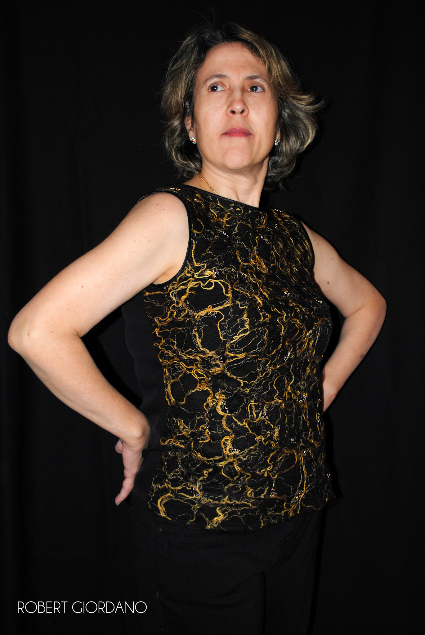 Custom print, cotton sateen shift dress hand embroidered with orange silk thread and lined with silk charmeuse. Custom Golden button closure. Styled with custom necklace.